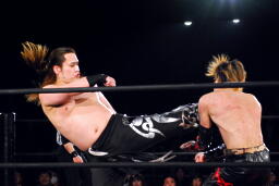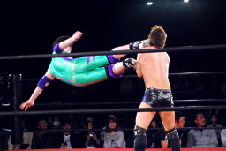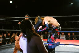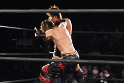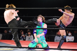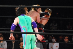 矢野ドロップキック(右写真)、イサミにタッチ。