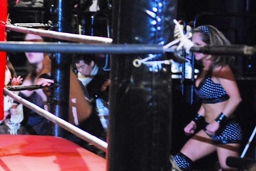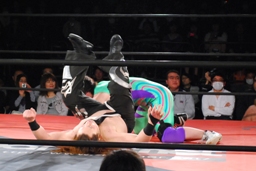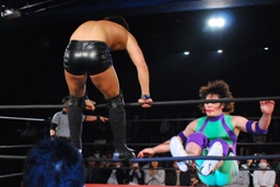 イサミコーナーに上げて雪崩式フランケンシュタイナー(左写真)、円華は場外転落。