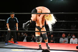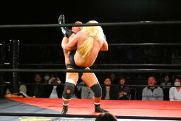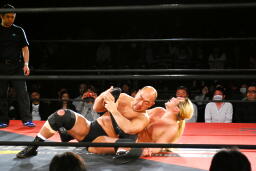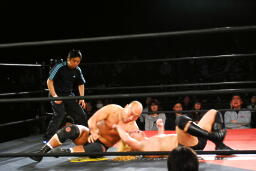 大家着地してヘッドバット、ジャーマンスープレックスホールド(左写真)、カウント2。