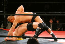 高岩ブレーンバスターの体勢、大家ブロックして逆に投げる(左写真)。