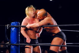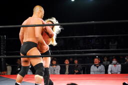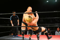 大家エルボー、高岩もエルボー返す。打ち合いから高岩ロープに振ってエルボー(左写真)。