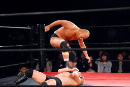 高岩コーナーに詰めて逆水平、エルボー(右写真)、逆水平。対角線コーナーに振って串刺しエルボー。ボディスラムからコーナーに上ってダイビングエルボードロップ、カウント2。