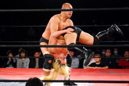 大家ボディスラム、コーナーに上る、高岩立ち上がって張り手、雪崩式ブレーンバスター(左写真)、カウント2。