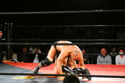 大家ヒザを着いて起き上がり高岩のボディにパンチ、高岩はエルボー(左写真)。