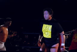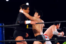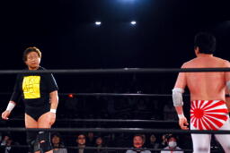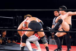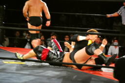 天龍エルボードロップ(右写真)、カウント2。天龍スリーパー、石川立ち上がってコーナーに押し込むと菊地にタッチ。