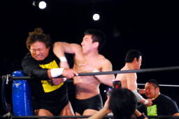 ユニオン勢が先制攻撃掛ける、妻木が天龍にエルボー!(左写真)強心臓なのか怖い物知らずなのかバカなのかは知らんがこうでないと。