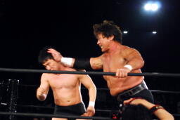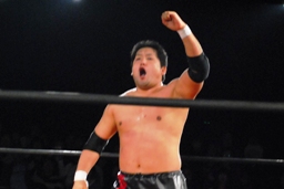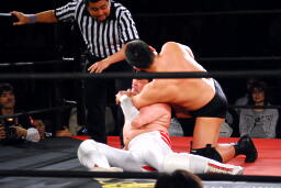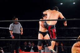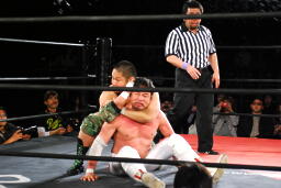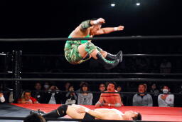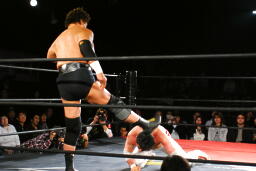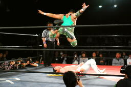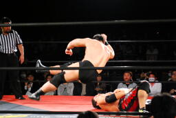 入江ボディスラム、ジャンピングボディプレス(左写真)、カウント2。