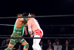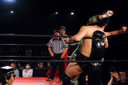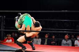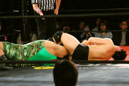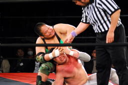 DDT(右写真)、カバーは妻木がカット。菊地はこの間になんとか石川にタッチ。