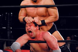高木ボディスラムからニードロップ。菊地はロープにつかまって立ち上がろうとする。目尻からは流血(左写真)。