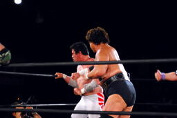妻木エルボー連打(右写真)、天龍も思わずヒザを着く。妻木ストンピング。天龍エルボー打ち返し場外に出すと逆水平、イス攻撃。リングに戻す。