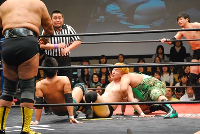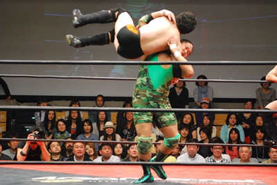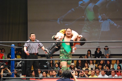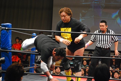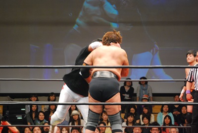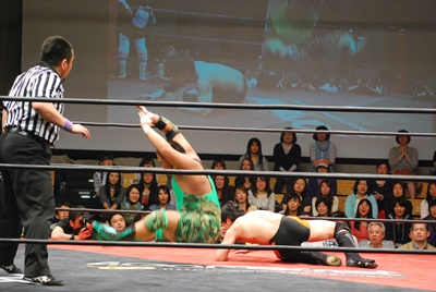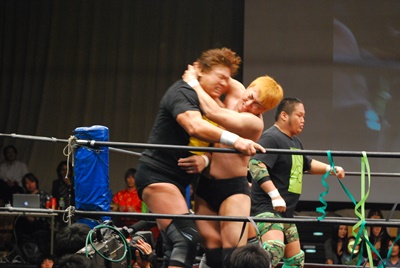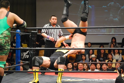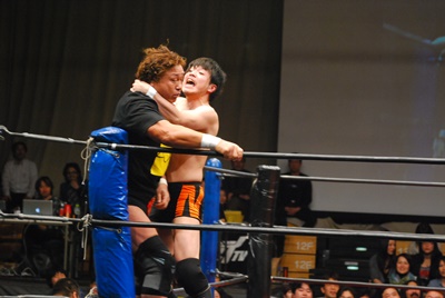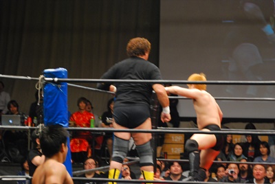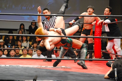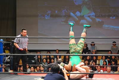 ロープに振らずにブラックホールスラム(右写真)、妻木がカット。澤が妻木を外に出す。
