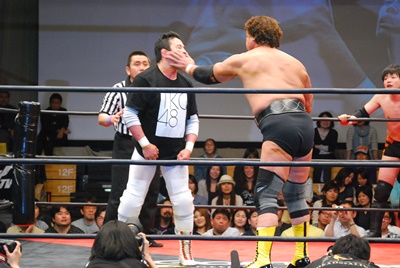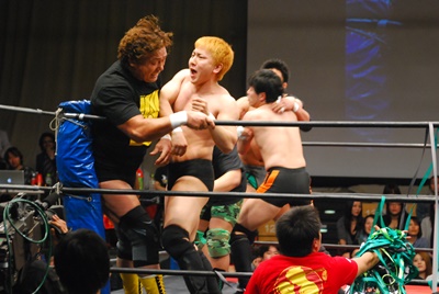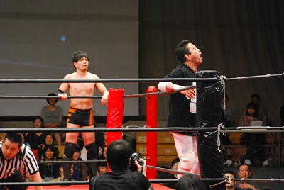 出番が来ない菊地はエプロンで吼える(左写真)。冨永困惑。