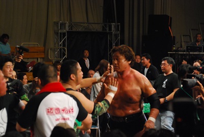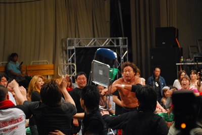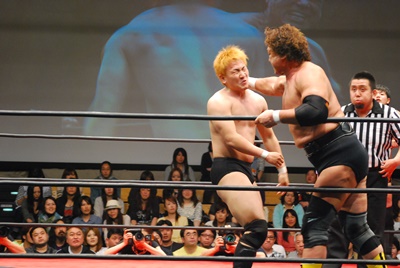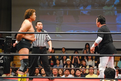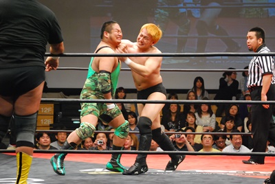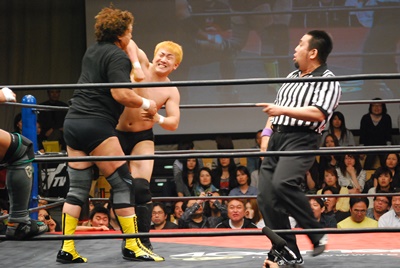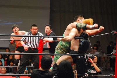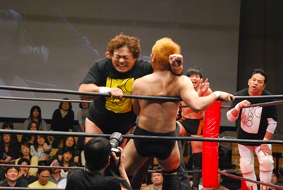 天龍と菊地は場外乱闘中。入江が止めに入る(右写真)。