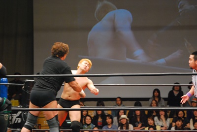 天龍が逆水平、ブレーンバスター(右写真)、カウント2。入江にタッチ。5分経過。