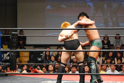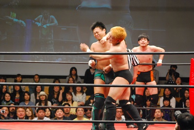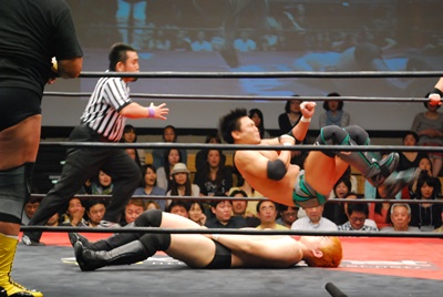 冨永回転エビ固め、入江ブロックしてヒップドロップ、冨永かわす(右写真)。