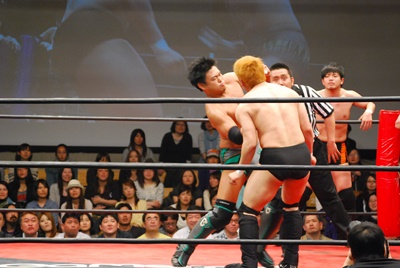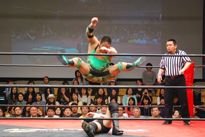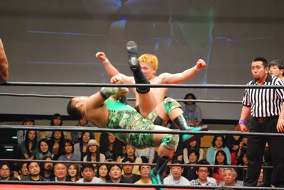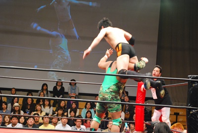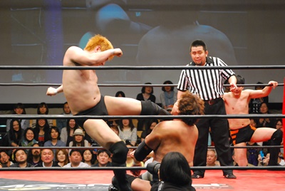 入江ロープに飛ぶ、妻木ドロップキック、入江倒れず再度ロープに飛ぶ、妻木ダッシュミドル(右写真)、菊地にタッチ。入江も天龍にタッチ。