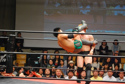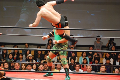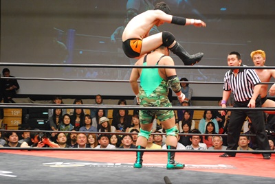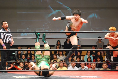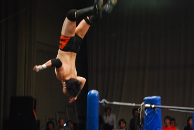 冨永が入江と澤を場外に落としてケブラーダ(右写真)。菊地は妻木にタッチ。10分経過。