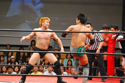 妻木がいきなり天龍にエルボー(右写真)。いいぞ、やれやれ!