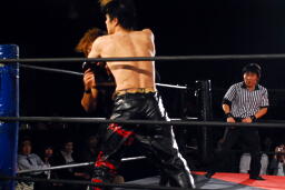 MIKAMI引き起こしてブレーンバスター、イサミ着地、ロープワークからMIKAMIの背中にドロップキック(左写真)。