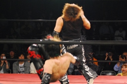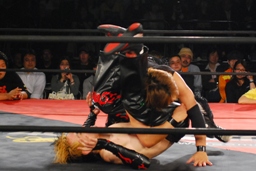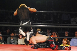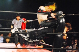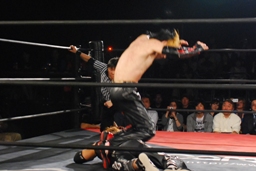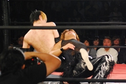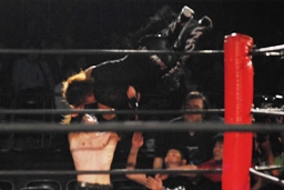 MIKAMIはイサミの首にパンチ、ニードロップ(右写真)。首はイサミが長期欠場した古傷。それを知っているMIKAMIだからこその攻撃。