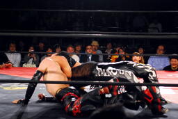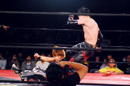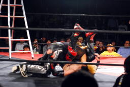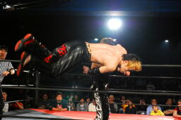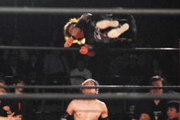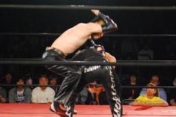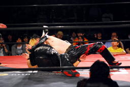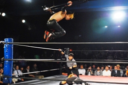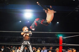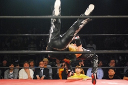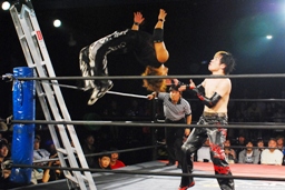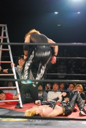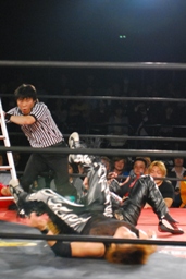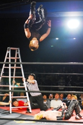 MIKAMIがラダーをリングに持ち込んでコーナーに立てかける。MIKAMIイサミを振る、イサミ切り返す、MIKAMIラダーを蹴ってムーンサルトアタック(右写真)、エビに固める、カウント2。