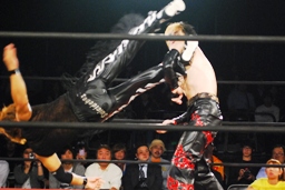 イサミはMIKAMIをコーナーに固定して背中にダブルニーアタック(右写真)