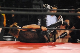 MIKAMIはイサミを場外に落とし(右写真)ケブラーダ狙うがイサミは足を引っ張って落とす。