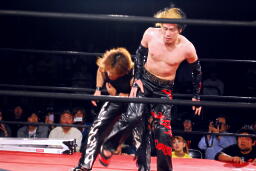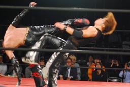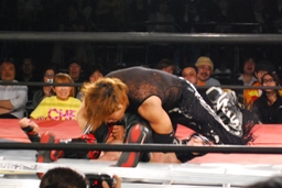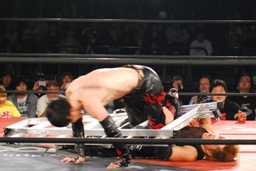 ラダーの足にイサミの首が直撃!(右写真)、カバー、カウント2。