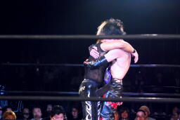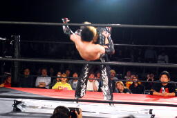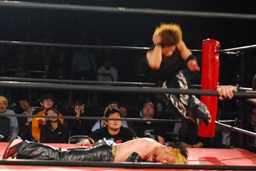 MIKAMIはラダーの上にイサミを寝せるとコーナーに上ってスワントーンボム、イサミかわす(左写真)。