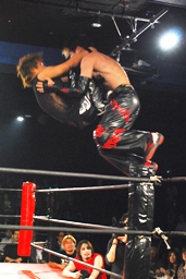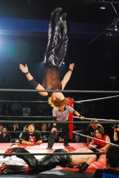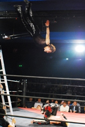 MIKAMIラダーに上ってヴォルカニックボム、イサミはヒザを立てて待つ(左写真)。