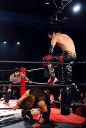 イサミコーナーに振って突っ込む、MIKAMIキック、コーナーに上ってイサミの背中にミサイルキック(左写真)。