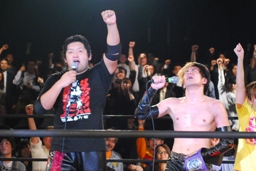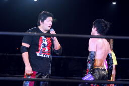 石川「いやもう最高にカッコ良かったよ。凄い勇気もらった。俺もお前に負けないように頑張って両国のリングに立つから、一緒にユニオン盛り上げていこうぜ。でもやっぱり気まずいから、今日はお前が締めろ。」(左写真)