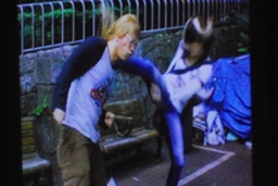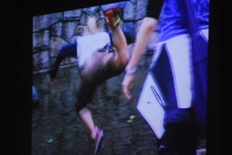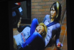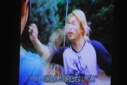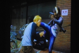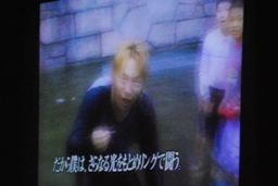 それを覗き込む大家を後ろからキック(左写真)、大家水中に転落。