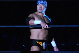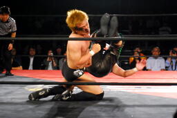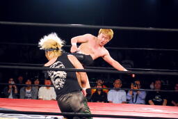 しかしタッチには行かずロープに振ってドロップキック、ウラノはロープをつかんでスカす。ウラノロープに飛ぶ、妻木カウンターのドロップキック(左写真)、諸橋にタッチ。