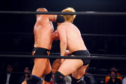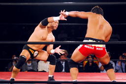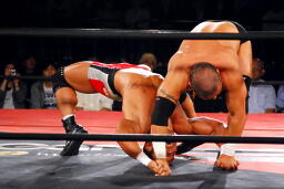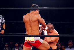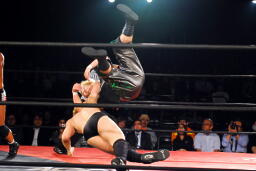 東郷押し返す、諸橋ブリッジで耐える(左写真)、東郷乗る。東郷が立ち上がると諸橋はジャンプしてモンキーフリップ、東郷側転して着地。