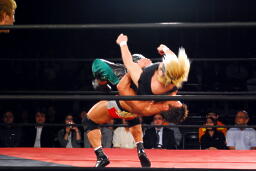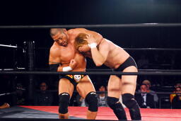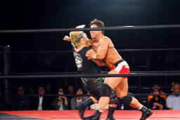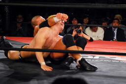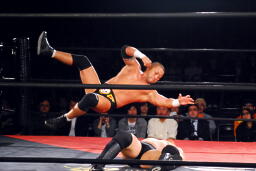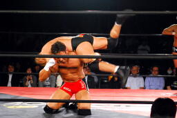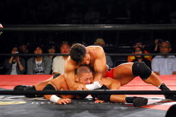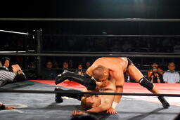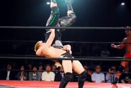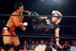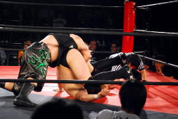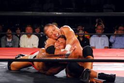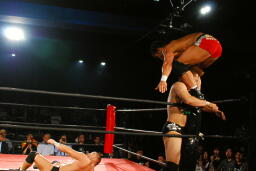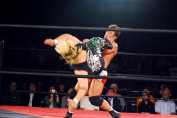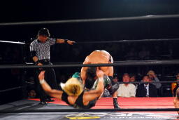 妻木裏投げ(右写真)、カウント2。ミドルキック連打、カバー、東郷がカット。