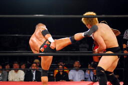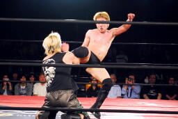 ウラノローキック、逆水平。妻木はエルボー(左写真)、ウラノ逆水平。