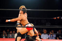 ロックアップ、東郷バック取る、諸橋腕取って切り返す。東郷カニばさみからヘッドロック、東郷腕を取ってハンマーロックに、諸橋潜り込んで飛行機投げ(右写真)からアームロック、東郷下から蹴ってブレーク。両軍タッチ。