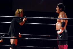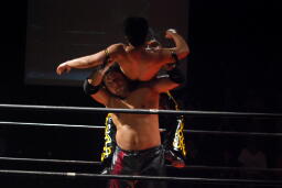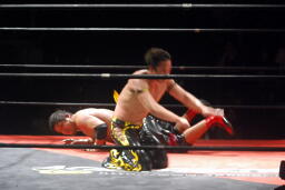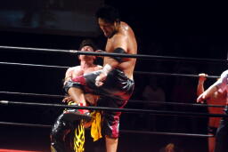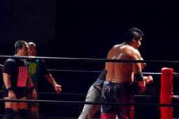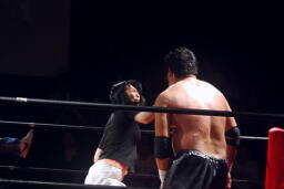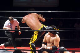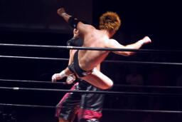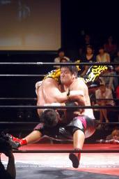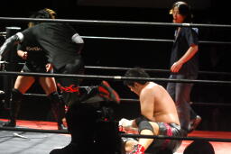 妻木がKUDOをパワーボムでマットに叩きつける(左写真)。