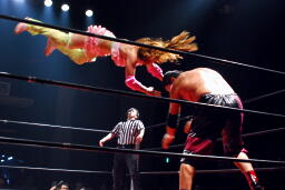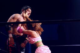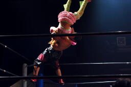 先に入場したチェリーは北側ひな壇席で待ち伏せ、花道を入って来た石川にミサイルキック、さらに花道ドロップキックで場外に落とす。さらにコーナーからプランチャに行くが石川はキャッチ(左写真)。