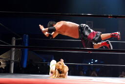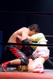 石川また無造作に投げ落すと今度はコーナーからダイビングボディプレス、チェリーかわす(右写真)。