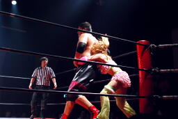 助走付けてボディプレス(右写真)、カウント2。