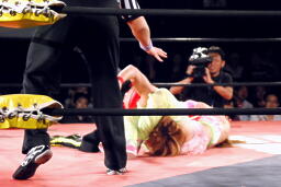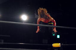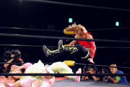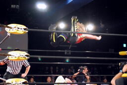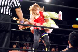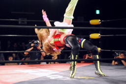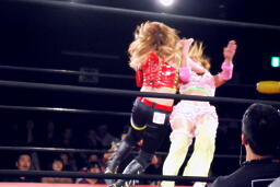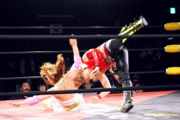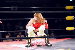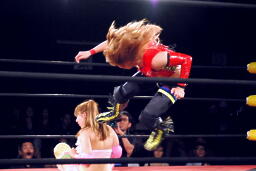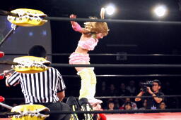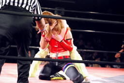 チェリーフライングネックブリーカードロップ、奈苗かわしてドロップキック(右写真)。奈苗ネックロック、チェリーロープ。奈苗ヘッドロック、チェリーロープに振る、奈苗ショルダーブロック。
