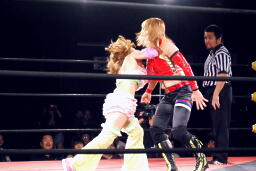 最初なかなか組まない。ようやくロックアップ、奈苗がロープに押し込んでブレーク。再度ロックアップ、チェリーロープに押し込んで張り手(左写真)、奈苗も張り手打ち返す。
