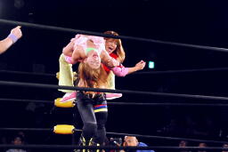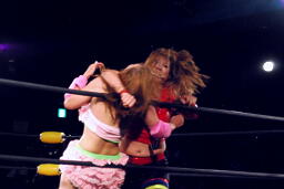 奈苗リリース、チェリーソバット、フェースクラッシャー、ストンピング。背中に飛びついてスリーパー左写真)。