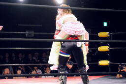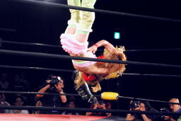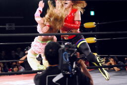 チェリーウラカン・ラナ狙う、奈苗はキャッチしてパワーボムに(右写真)。