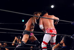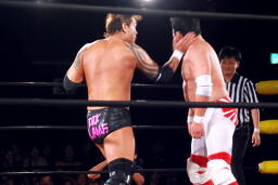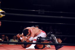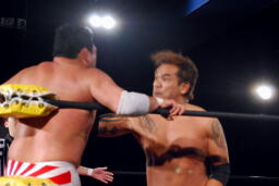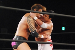 ロックアップ、菊地バック取る(左写真)、矢郷切り返す。菊地切り返してハンマーロック、矢郷パンチ入れて切り返す、菊地ロープ。