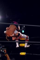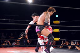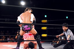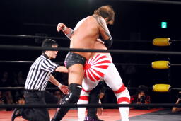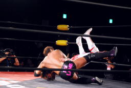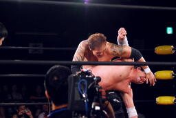 矢郷菊地をロープの間から引き込むとイーヴンフローDDT(左写真)、カウント2。