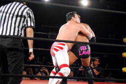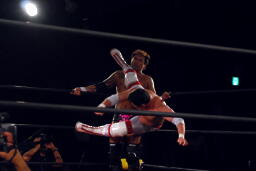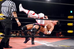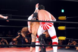 矢郷ヒザ蹴り入れてドラゴンスープレックス(右写真)。菊地は場外エスケープ。