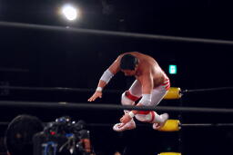 矢郷をコーナーに上げてスパイダー式フロントスープレックス(左写真)